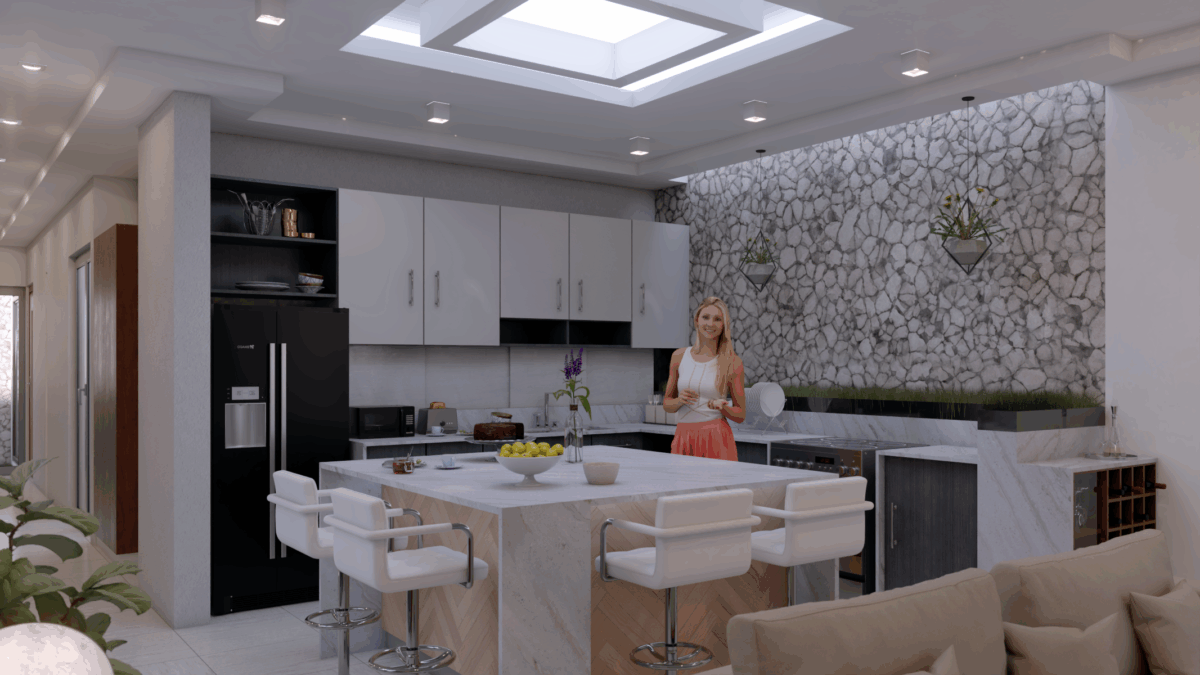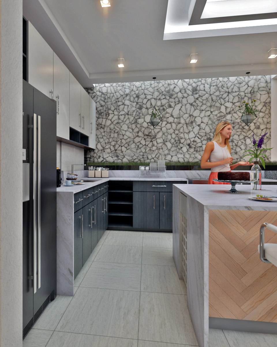El diseño es una variante del diseño de una vivienda donde se busca tener una opción en los acabados de cocina en tonos más claros y llenos de luz. Se busca que los acabados no superen las tres unidades. Se incorpora un acabado pétreo bañado por la luz de un lucernario que provoca sombras que van variando según el ángulo de incidencia solar, también hay un lucernario central sobre un área de Isla multiusos que funciona como comedor y área de alacena.